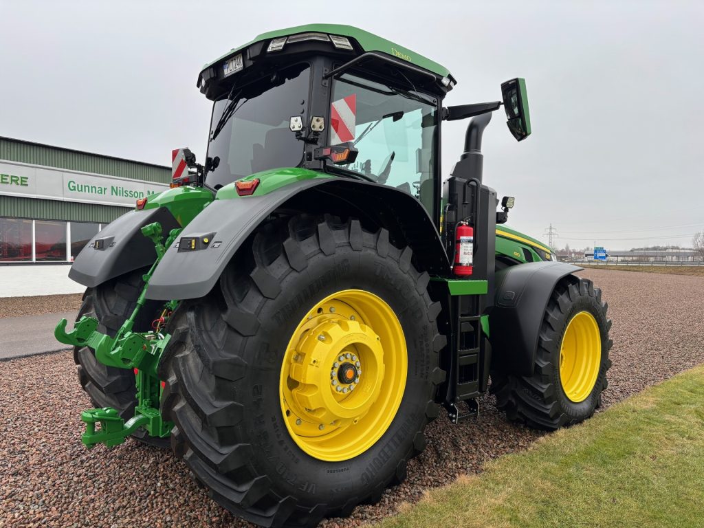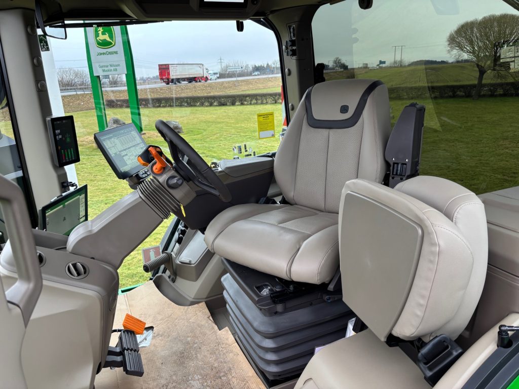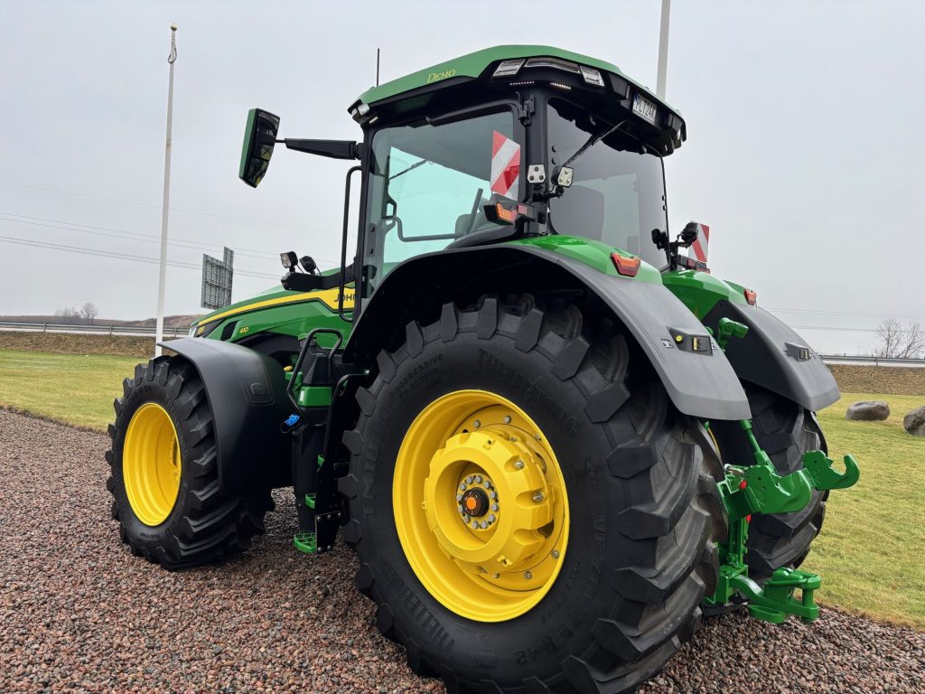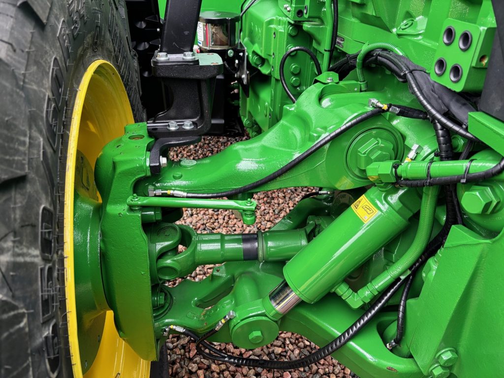 John Deere Signature Edition, eAutoPowr elektrisk variabel växellåda (EVT) 40 km/h, CommandPRO, Ultimate Comfort- och Convenience-paket, ActiveSeat II, Ultimate Visibility-belysniningspaket, G5Plus CommandCenter med G5Plus utökad monitor, Integrerad StarFire 7500-mottagare med SF1 G5 Advanced 3-årslicens, JDLink, Hydraulisk servostyrning, Dubbel hydraulpump, 318 l/min, Fem elektriska 1/2tum hydrauluttag bak, 45 mm 1000 rpm och 1000 ekonomi rpm kraftuttag, växlas elektroniskt i hytt, 3-punktslyft kapacitet: 9000kg, 3-i-1-lyft, inkluderar skenor och dragbom i kategori 4 att använda med en sprint på 50 mm, inklusive gaffel, ILS med oljebroms framaxel, Trelleborg Bak VF710/75R42, Fram VF650/60R34, Elektronisk startspärr, Tonad bakruta. Integrerat roterande ljus, Generator 330A, Förberedd för John Deere maskinsynkronisering, Behållare för hög oljekapacitet, 80 mm kuldragsinsats för 3-i-1-lyftskensystem, Premium frontlyft, Vagnsbroms, tvåkrets-luftbroms och tvåkrets-hydraulbroms, Hjulvikter: Ett par 620 kg, Ett par startvikter på 72 kg och ett par vikter på 205 kg, Centralsmörjning på framaxel, Demotraktor tillgänglig tidigast 2026-10-20